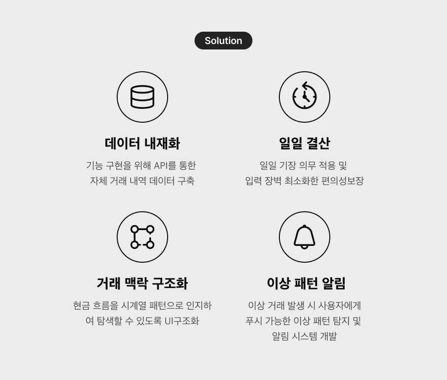 최소 기능을 통해 의사 결정 가능한 데이터 구조를 수립하고 결산 프로세스에 필요한 핵심 요구사항 검증을 위해 속도와 즉시성을 중시한 MVP 구조로 시스템 구축