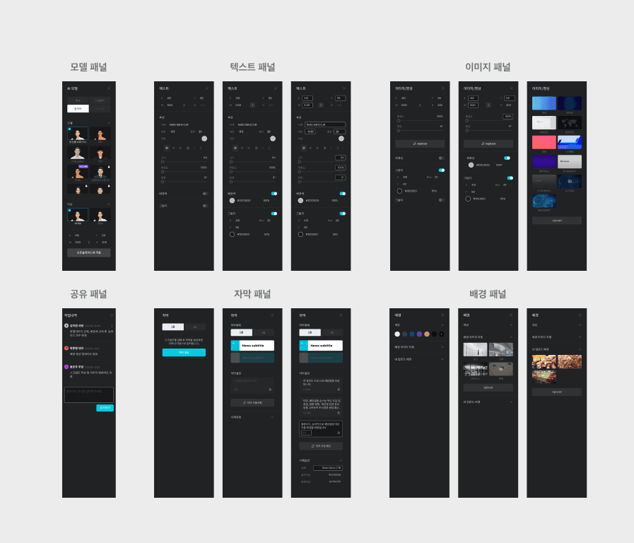 영상 화면을 즉석에서 편집하고 싱크를 맞출 수 있도록 [요소 추가-설정-세부설정]의 단계 내에서 모든 액션이 이루어 지도록 의도하였고,복잡하고 우선도가 낮은 기능을 2depth로 분류하여, 사용자에게 필요한 최소한의 기능만 우선적으로 보여지도록 쉽고 단순한 UI로 진입 장벽을 최소화 했습니다.