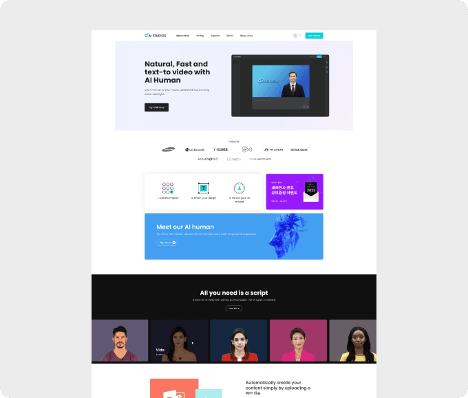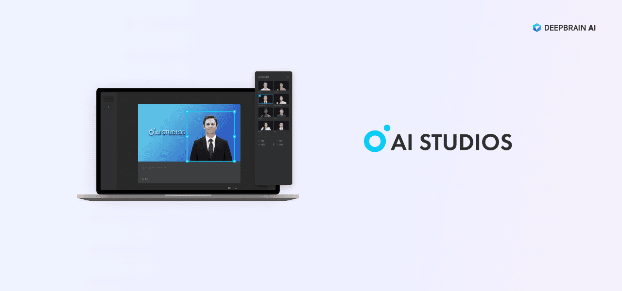 AI STUDIOS는 사용자 입력 텍스트를 AI 휴먼을 이용해 영상으로 생성하여 제공하는 서비스로, SMB고객들을 주력으로 하는 서비스 입니다.