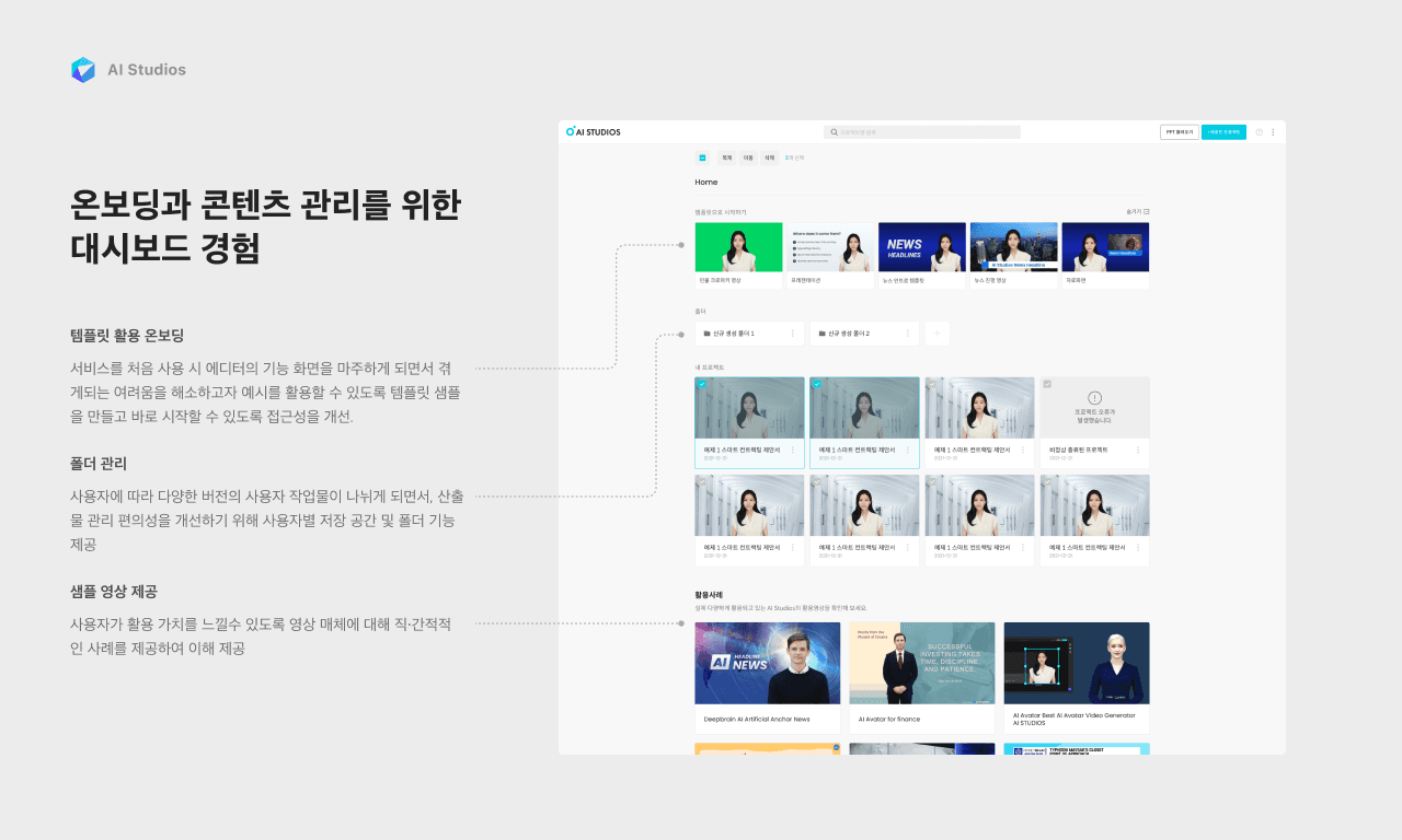 서비스를 처음 사용 시 에디터의 기능 화면을 마주하게 되면서 겪게 되는 어려움을 해소하고자 예시를 활용할 수 있도록 템플릿 샘플을 만들고 바로 시작할 수 있도록 접근성을 개선하였고 사용자가 실제 활용 가치를 경험할 수 있도록 영상 매체에 대해 직·간적적인 사례를 제공하여 이해를 돕도록 합니다.