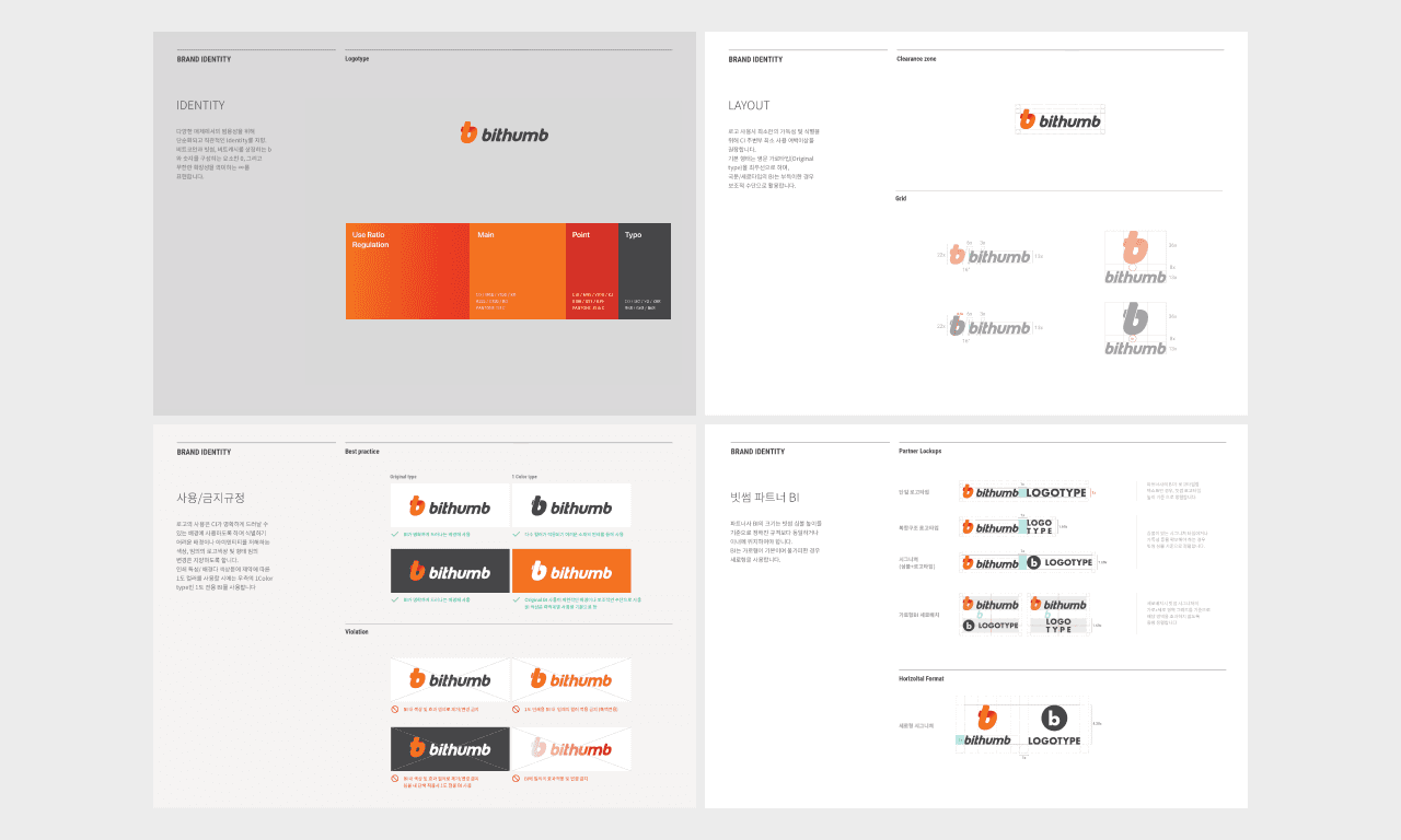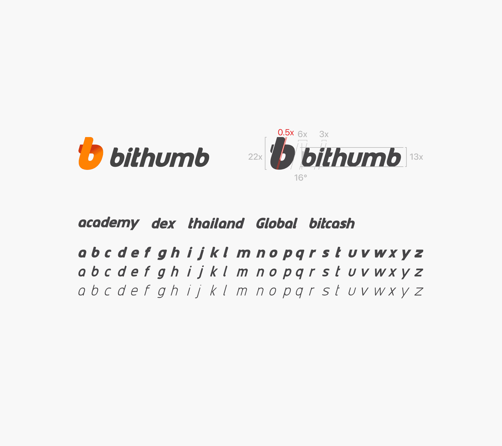 빗썸 내 계열사 브랜드와 하위 서비스 브랜드명을 일관적으로 사용하기 위해 로고타입을 재정립하여 폰트를 두께별로 제작 후 규격화 하였고, 가이드 내에서 활용 가능하도록 배포했습니다.
