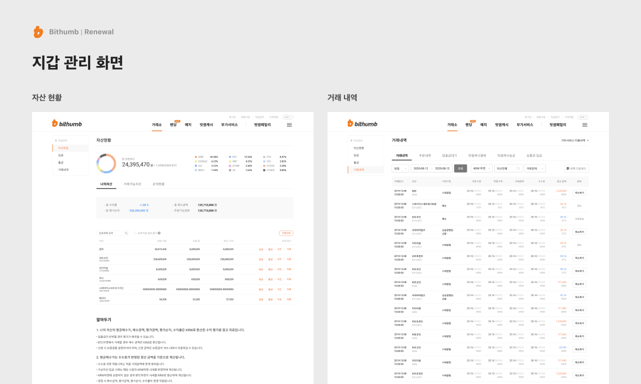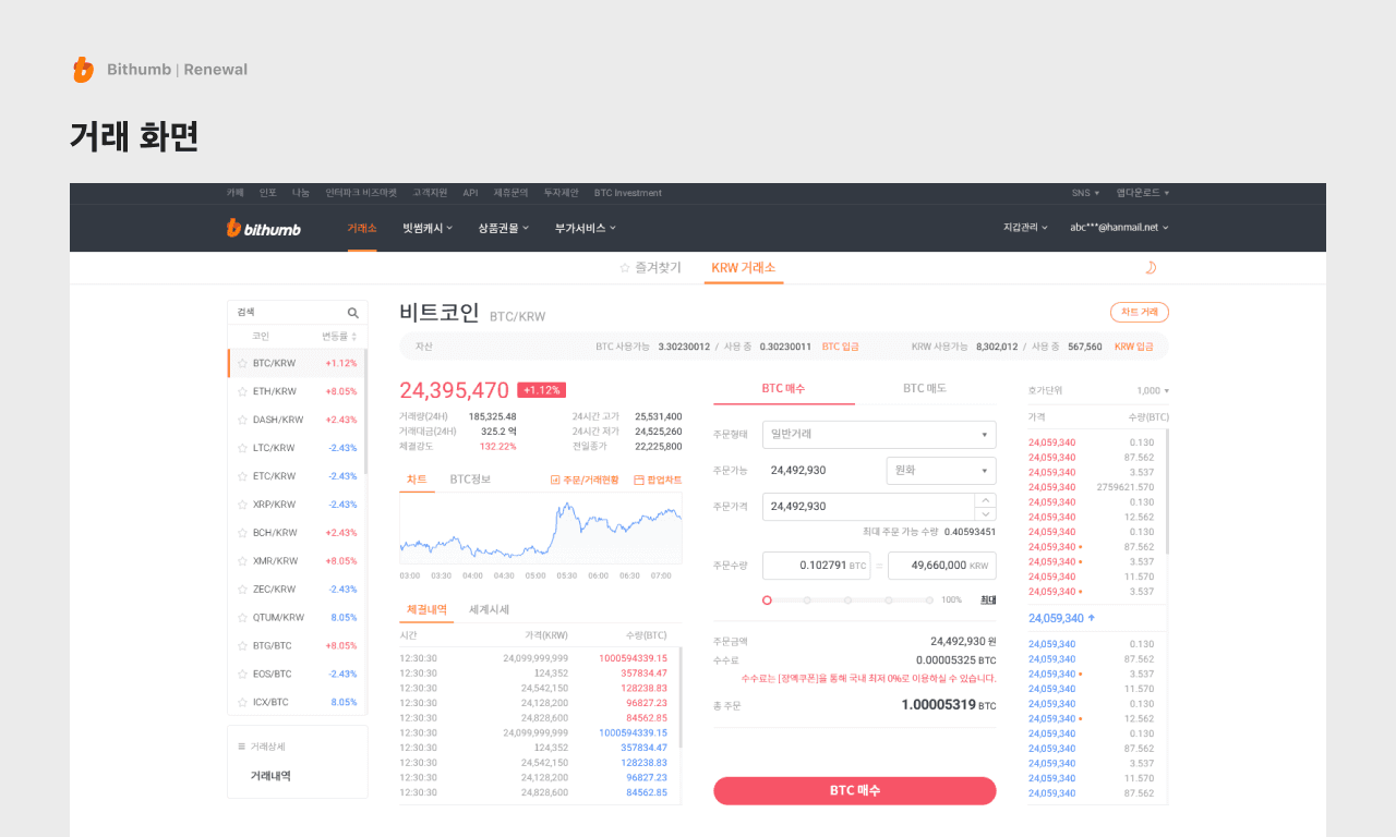 암호 화폐 거래소인 빗썸의 메인 IA를 간소화 하고 서비스의 본질을 강화하는 방향으로 디자인 하였고 메인 화면부터 거래 화면,