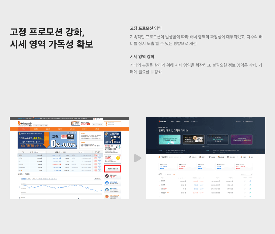 지속적인 프로모션이 발생함에 따라 프론트 화면에서 다수의 배너를 상시 노출 할 수 있는 방향으로 개선하였고 거래의 본질을 살리기 위해 시세 영역을 확장하고, 불필요한 정보 영역은 삭제, 거래에 필요한 UI강화하였습니다.