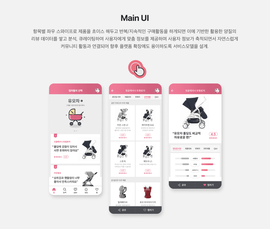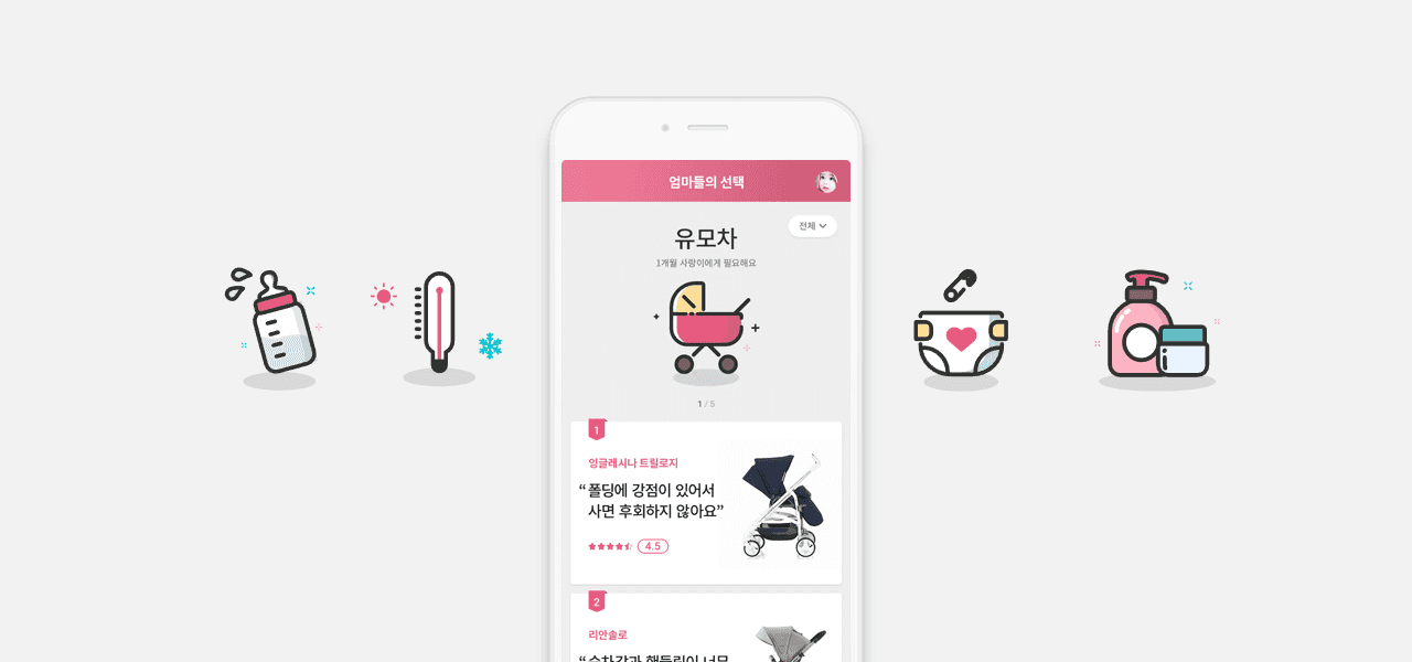 시기 별로 나에게 알맞는 정보를 먼저 제안해주고 적합한 제품 정보들의 리뷰를 비교, 커뮤니티로 연결할 수 있는 쇼핑 가이드 서비스를 제공하여 하나의 앱에서 육아 관련 정보를 활용할 수 있도록 하여 장기적으로 사용자와 팬층을 확보하도록 했습니다.