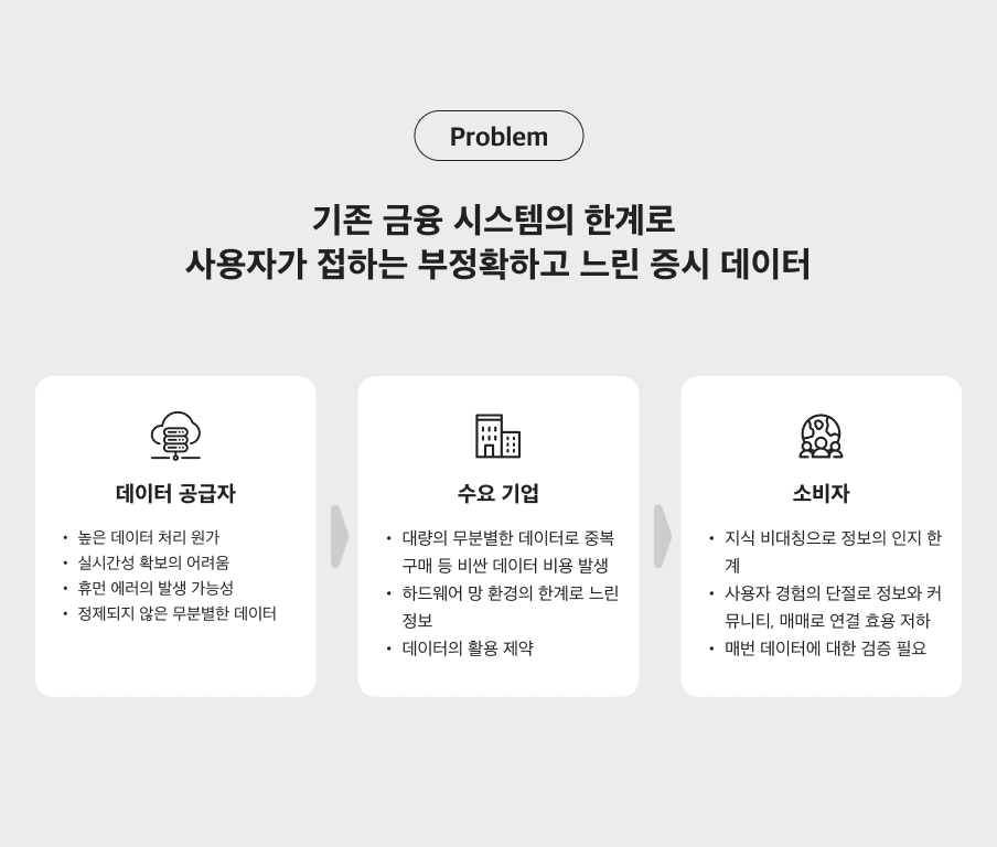 데이터 수요 기업 입장에서는 불필요하게 방대하고 비싼 데이터를 구매하여 모두 활용을 하지 못하고 필요할 데이터마다 중복 구매하여 불필요한 이슈 발생.