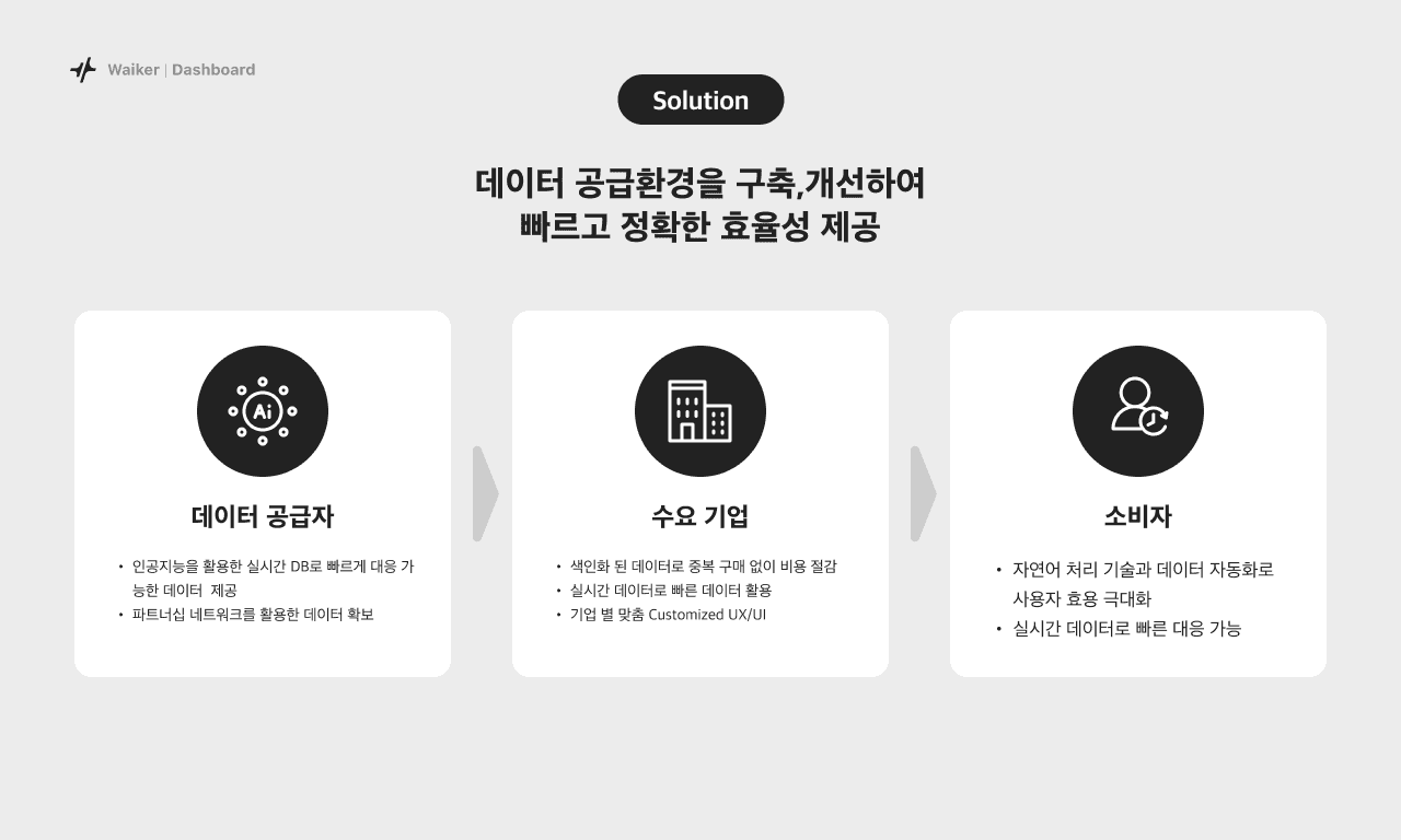 데이터 공급 환경을 개선하여 업무를 자동화하여 업무 환경의 효율성을 제시하고, 빠르고 정확한 데이터 경험을 제공하여 신뢰성을 쌓아 지속적인 고객을 확장하도록 합니다.